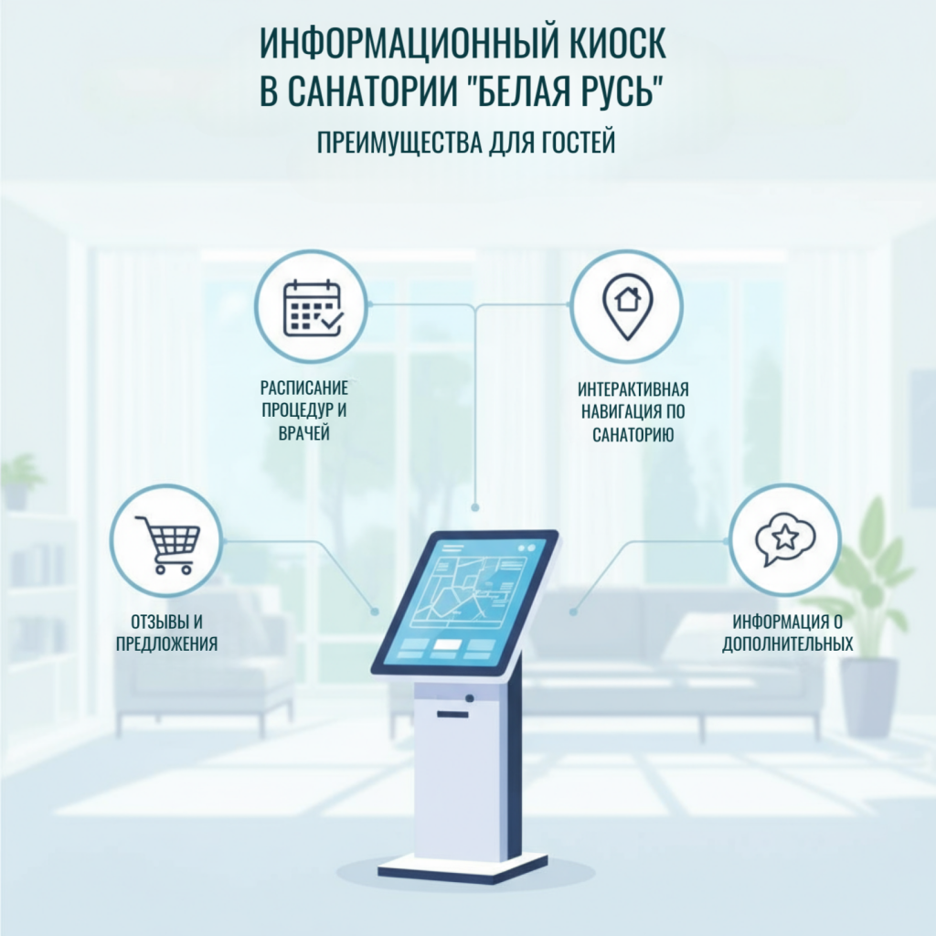 Вспомните, как раньше приходилось стоять в очереди к администратору, чтобы узнать расписание процедур или уточнить стоимость массажа. Терялись драгоценные минуты отдыха на Нарочи, которые могли бы провести у озера или на прогулке по сосновому бору. Теперь любой желающий может подойти к киоску в удобное время и получить исчерпывающую информацию.