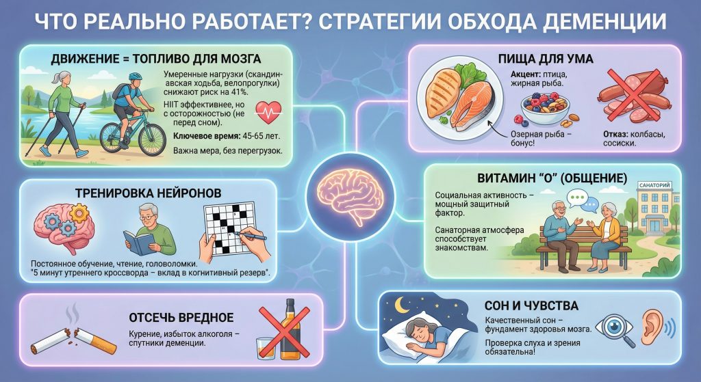 Движение: умеренные нагрузки снижают риск на 41%. Ключевой возраст для активизации — 45–65 лет. Санаторий «Спутник» предлагает групповые и индивидуальные занятия ЛФК с опытными инструкторами.