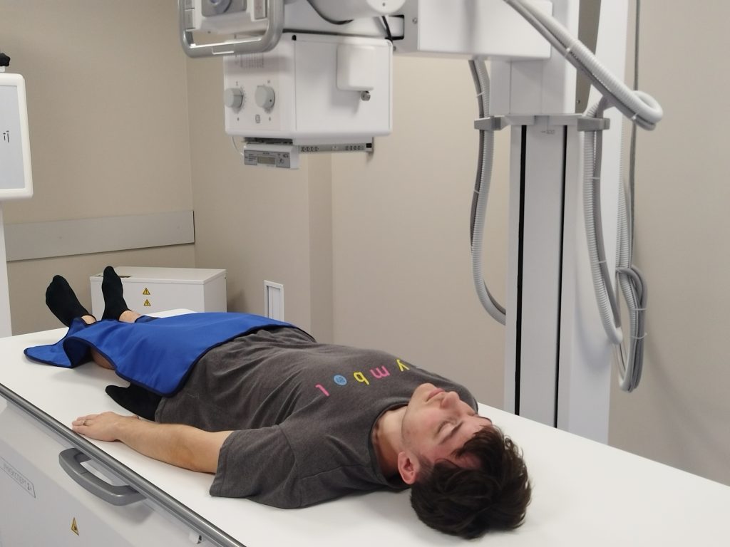 Рентген в Спутнике это стационарная цифровая система. Пациент ложится на широкую гладкую поверхность стола. Она похожа на жесткий матрас, а не на холодную медицинскую кушетку. Тело лежит ровно, что особенно важно для снимков позвоночника и грудной клетки.