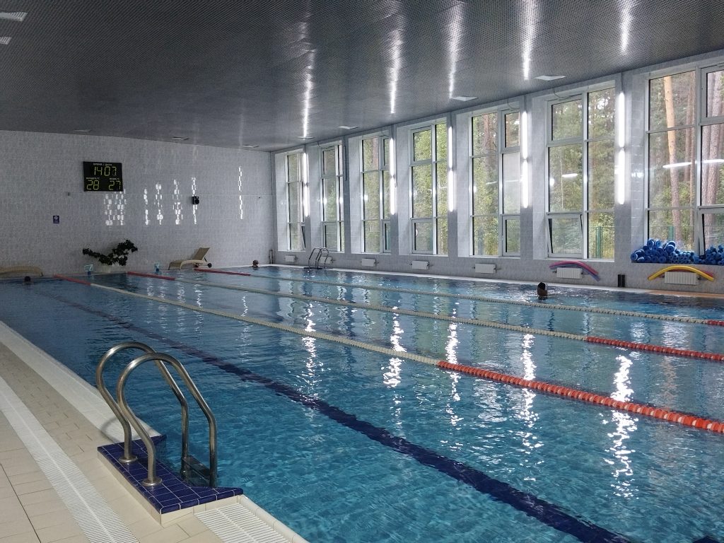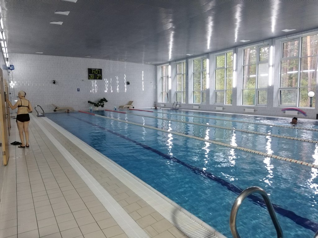 Большие панорамные окна во всю стену создают ощущение единения с природой. Пока вы плаваете, за окном шумят сосны, а свежий воздух наполняет зал легким запахом хвои.